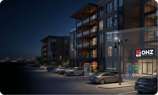 OHZ combines AI-powered video analytics with live remote monitoring to detect and respond to threats in real time. Our solutions are purpose-built for apartment complexes—covering parking lots, entry points, hallways, amenities, and more.