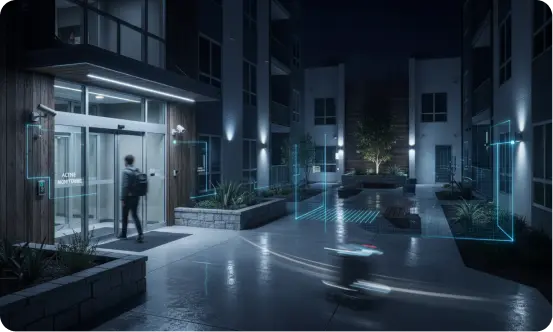 Apartment buildings have countless access points—stairwells, rooftops, side walkways—that are difficult to patrol. Continuous perimeter monitoring ensures intruders are spotted the moment they step onto the property. By tracking movement across every zone, threats are contained at the first sign of trouble and evidence is captured for prosecution.